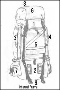 They may include the top pocket on a top-loading main compartment (#6 of internal illustration), lower external pockets (lower-left #6 of external illustration) and elasticized throw pockets (middle #6 of external illustration). Except that I wouldn't put the fuel bottle or other contaminants in a top pocket for fear of contaminating the contents of main compartments, they can be used to distribute the contents of #3, #5 and #6. The lower left pocket is where I keep my compass, flashlight, zip-locked toilet paper and iodine bottle.